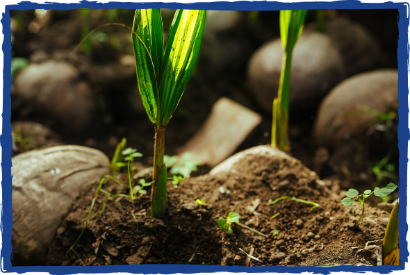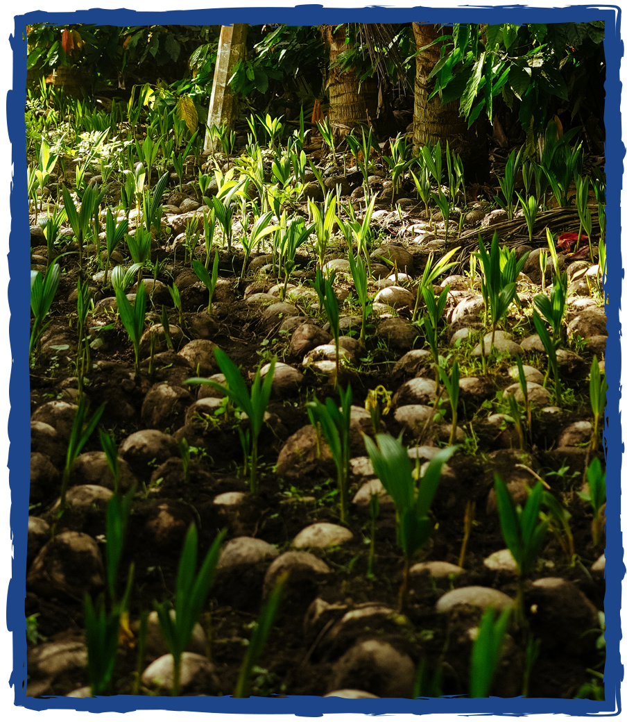 3. To plant a coconut seedling, farmers cut a mature coconut and bury it partially with dirt. From there, the seedling takes approximately three months to sprout. During the growing process, the seedlings require very little maintenance, other than an occasional watering.